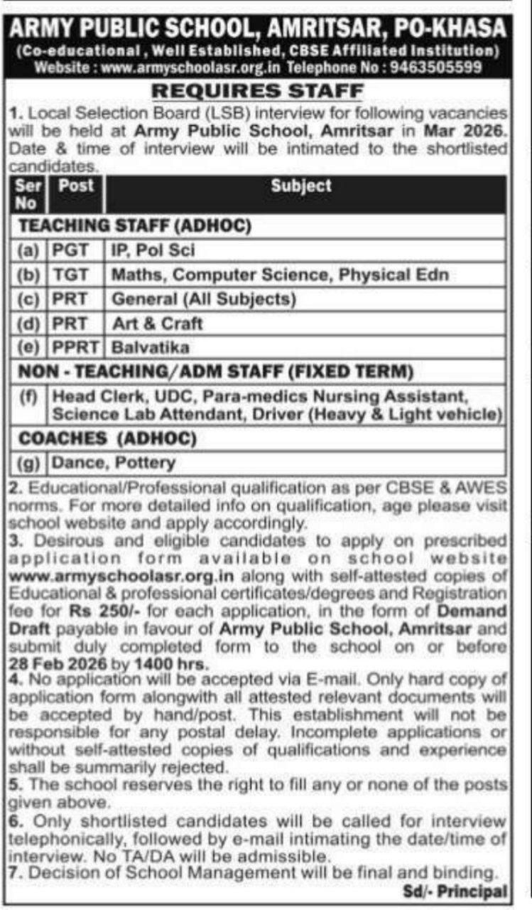 Army Public School, AmritsarTeaching and Non-Teaching Staff Vacancies 2026