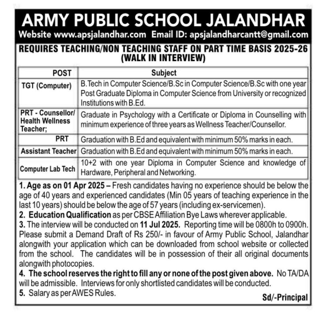 ARMY PUBLIC SCHOOL JALANDHARArmy Public School Jalandhar Jobs Notification 2025TEACHING/NON TEACHING STAFFON PART TIME BASIS 2025-26(WALK IN INTERVIEW)www.RozgarNews.Com