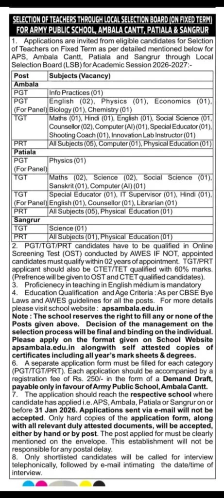 ARMY PUBLIC SCHOOL PATIALA,SANGRUR & AMBALA CANTT Recruitment 2026