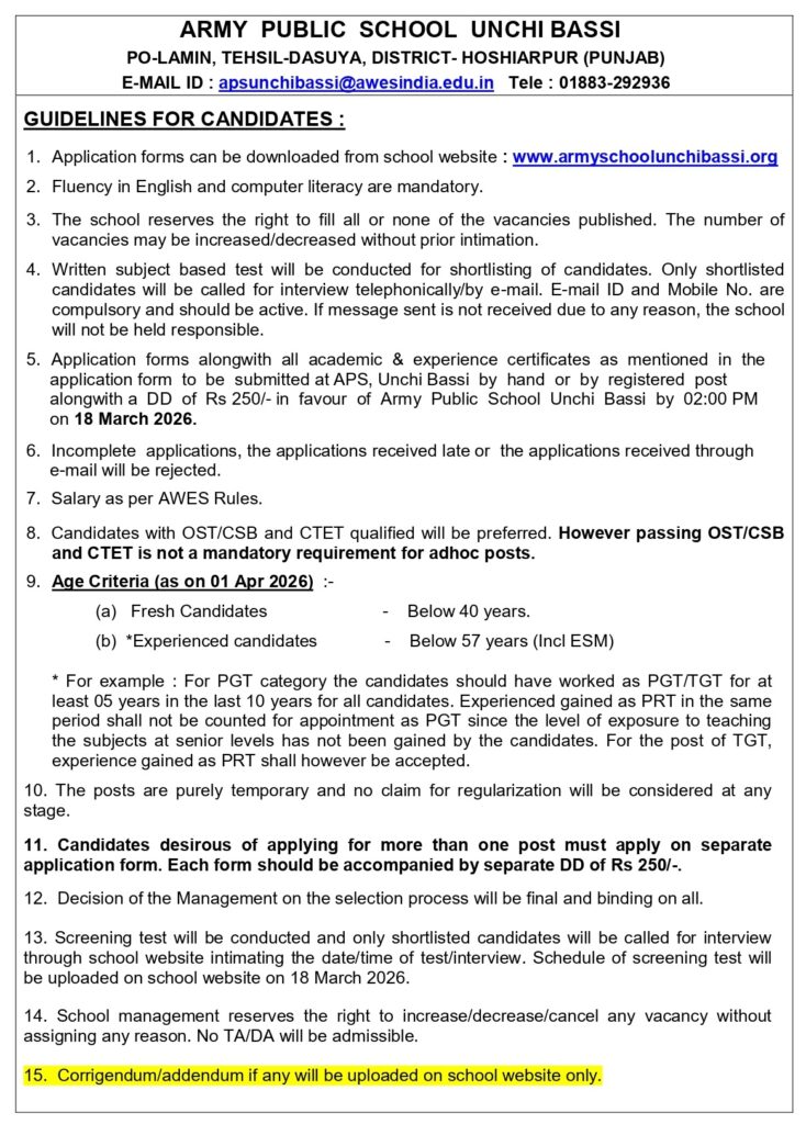 Army Public School Unchi Bassi, located in the Tehsil Dasuya of District Hoshiarpur, Punjab, is an esteemed educational institution dedicated to fostering the development of children in a disciplined and nurturing environment. This school stands as a testament to the commitment towards quality education, emphasizing academic excellence alongside character building.