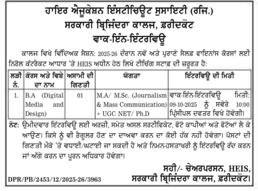 Higher Education Institute Society (Regd.)Government Brijindra College, FaridkotBrijindra College Faridkot HEIS Post 2025Walk-in-InterviewTeaching staff Postwww.RozgarNews.Com