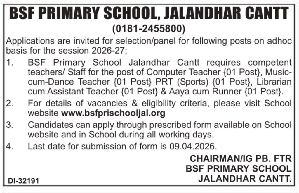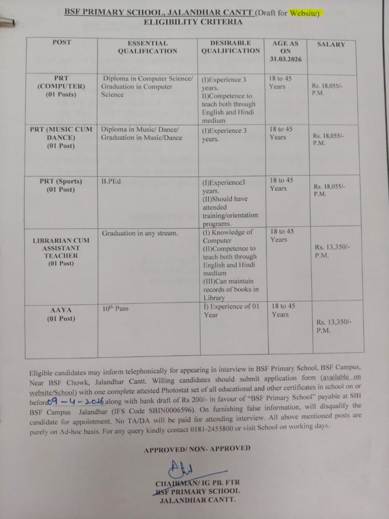 BSF Primary School Jalandhar Cantt Various Vacancy Staff on ADhoc Basis requirement 2026- 2027 |