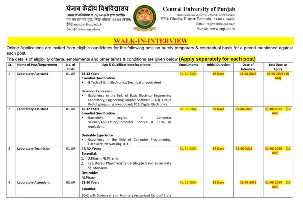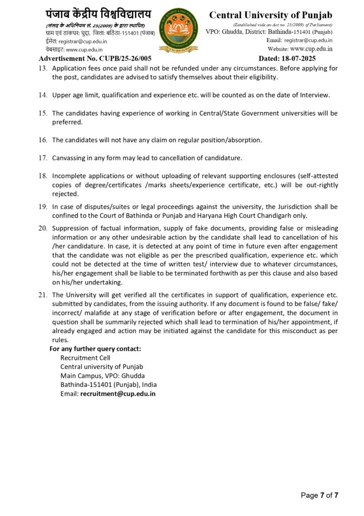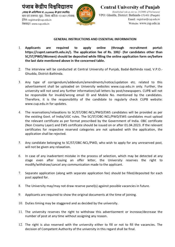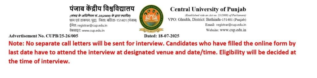 Central University Punjab Non Teaching Staff Recruitment 2025
