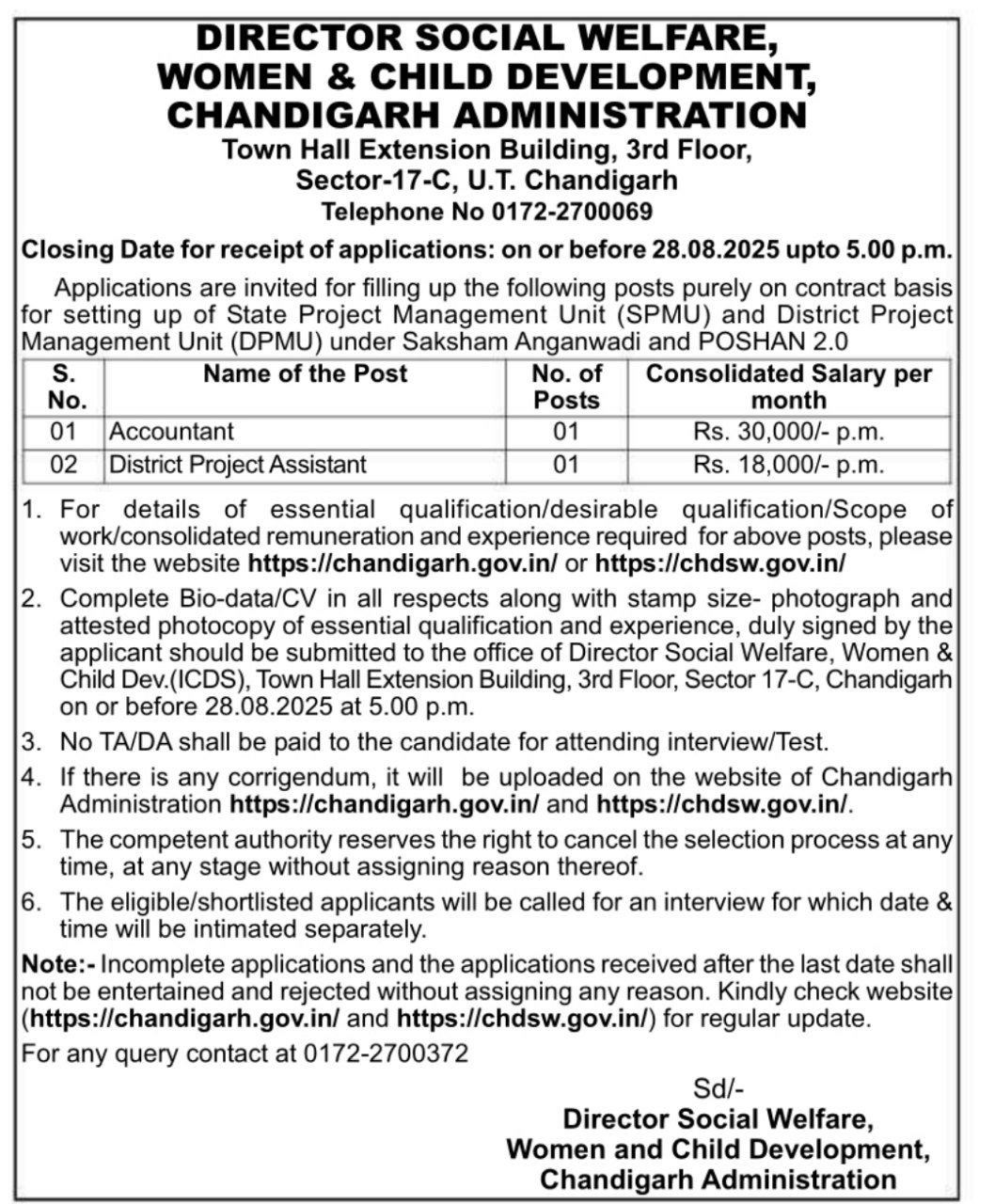 Chandigarh Accountant,District Project Assistant Recruitment 2025