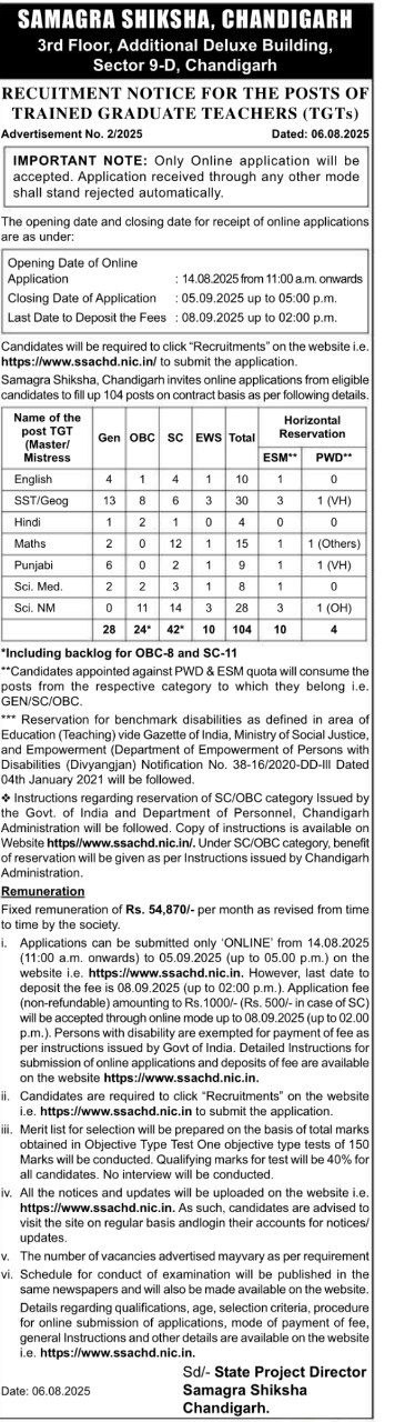 Chandigarh Trained Graduate TGT Teacher Recruitment 2025