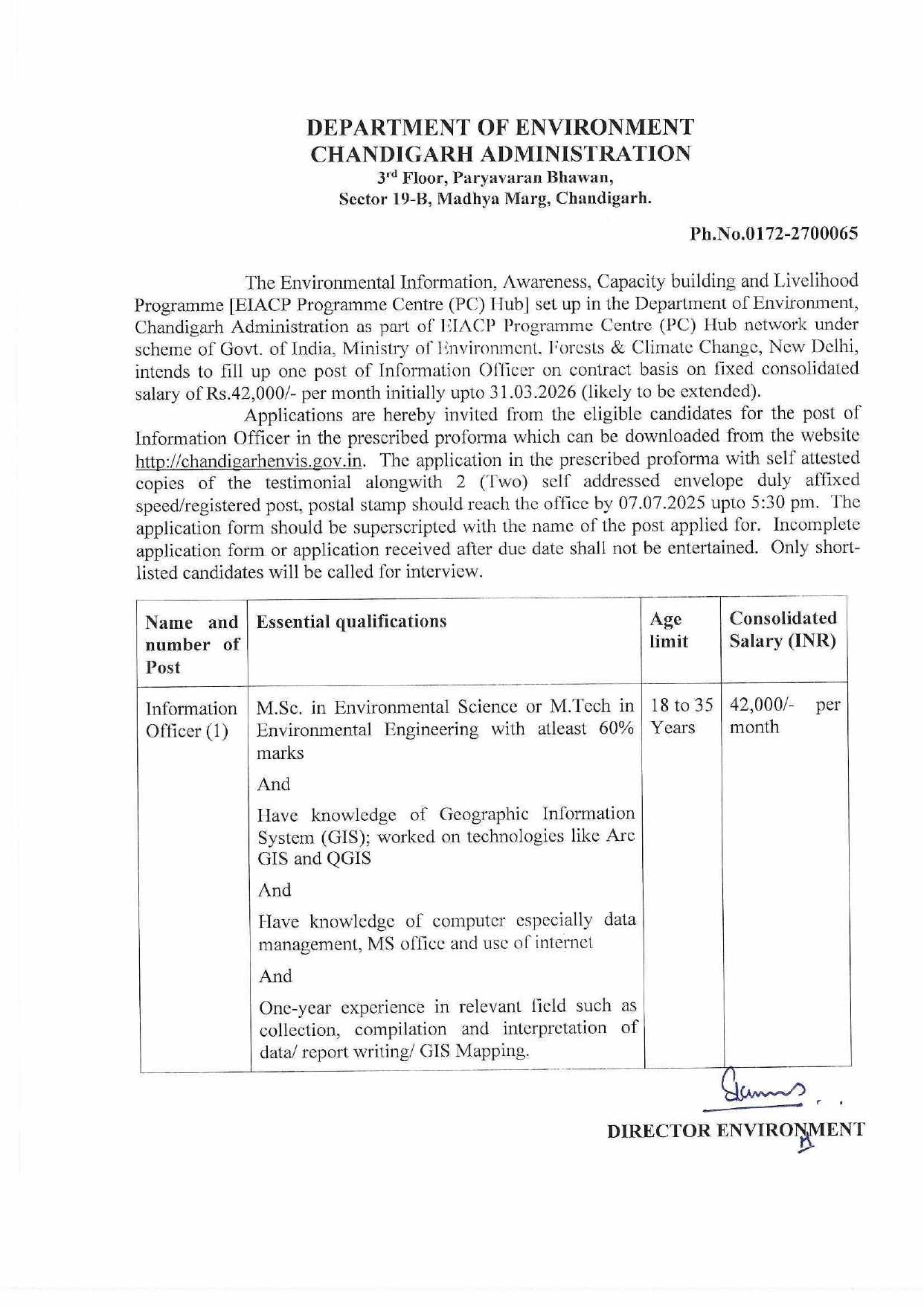 Department of Environment ChandigarhChandigarh Information Officer (ENVIS) Recruitment 2025Chandigarh Information Officer Recruitment 2025Department of Environment Chandigarh Information Officer Recruitment 2025Administration Recruitment 2025Department of Environment Chandigarh Recruitment 2025Information Officer Recruitment 20253rd Floor, Paryavaran Bhawan, Sector 19-B,Madhya Marg, Chandigarh.www.RozgarNews.Com