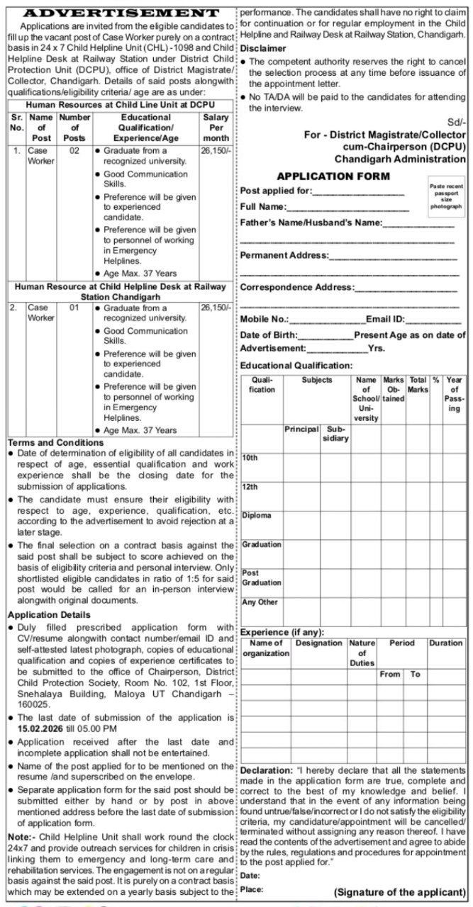 District Child Protection Unit Chandigarh Recruitment 2026District Magistrate/Collector cum-Chairperson (DCPU) Chandigarh Administration