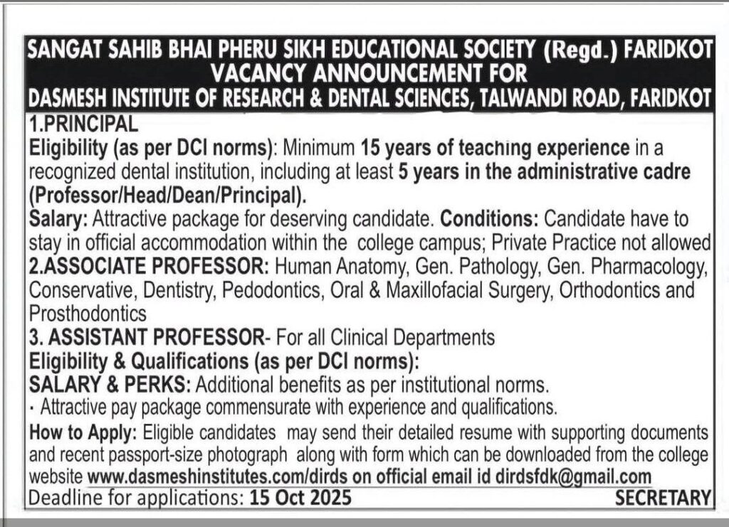 Faridkot Principal Vacancy 2025 Short Details