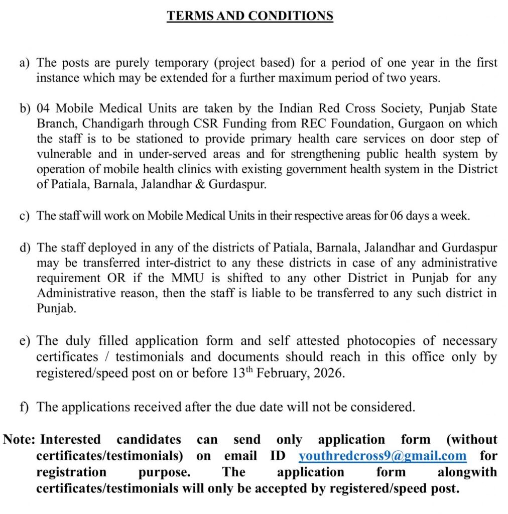 | The duly filled application form and self attested photocopies of necessary certificates / testimonials and documents should reach in this office only by registered/speed post on or before 13th February, 2026. Deputy Secretary, Indian Red Cross Society Punjab State Branch Sector-16-A, Madhya Marg, Chandigarh-160016