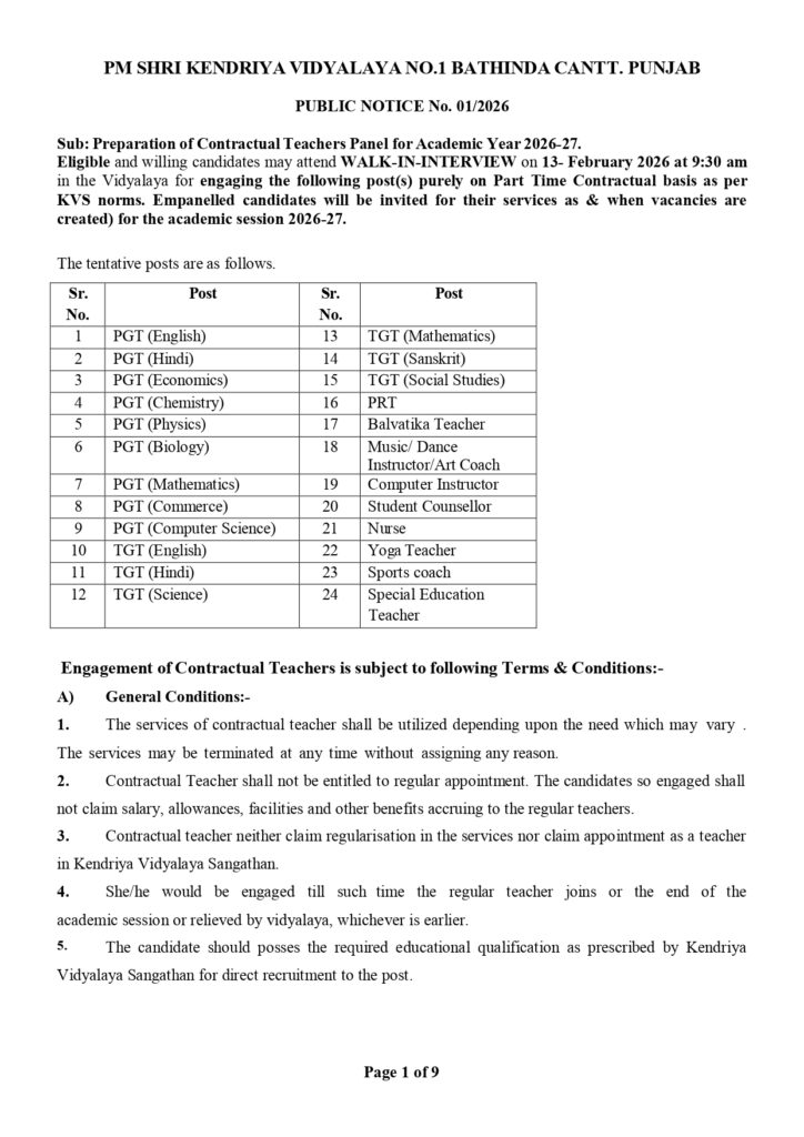 Kendriya Vidyalaya Sangathan (KVS) is set to initiate its recruitment process for the year 2026 at the Bathinda branch. This is an exciting opportunity for those looking to build a career in teaching and administrative positions within the prestigious KVS framework. Candidates can look forward to a fulfilling career that offers stability, growth, and the chance to influence young minds.