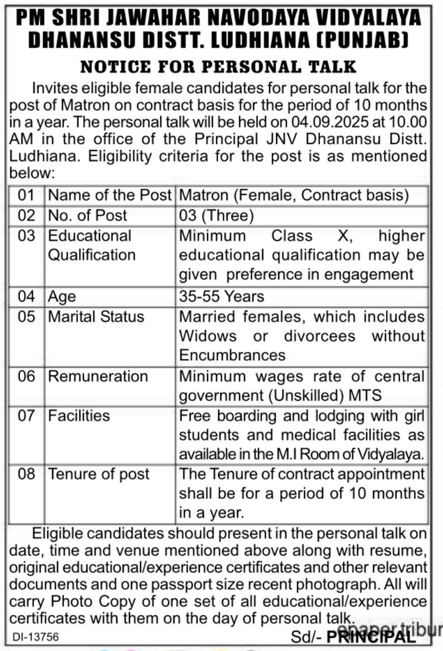 PM SHRI SCHOOL JAWAHAR NAVODAYA VIDYALAYADHANANSU DISTT. LUDHIANA (PUNJAB)Ludhiana JNV Matron Female Post 2025Female candidates for personal talk for the post of Matronon contract basis for the period of 10 months in a yearwww.RozgarNews.Com