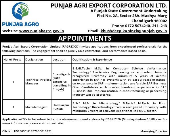 PUNJAB AGRI EXPORT CORPORATION LTD.A Punjab State Government UndertakingPlot No. 2A, Sector 28A, Madhya MargTechnical Project Manager,Microbiologist APPOINTMENTS 2026