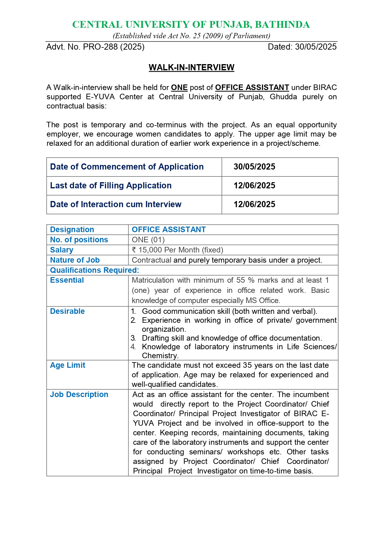 • Date of Interaction cum Interview: June 12, 2025 (10:00 AM onwards)