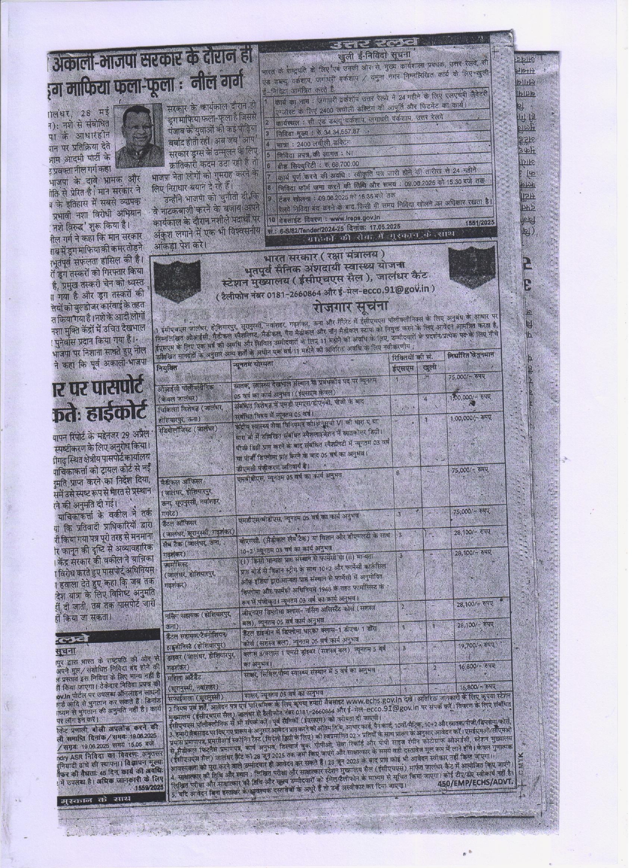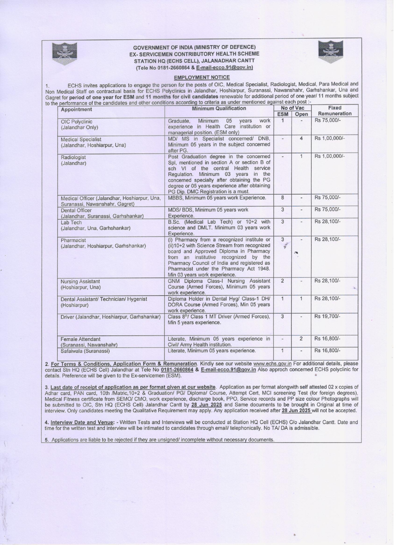 Ex-Servicemen Contributory Health Scheme, PunjabEX-SERVICEMEN CONTRIBUTORY HEALTH SCHEMESTATION HQ (ECHS CELL), JALANADHAR CANTTOIC, Medical Specialist, Radiologist, Medical, Para Medical and Non Medical Staff Vacancy 2025Short Details OfPunjab ECHS Various Vacancy Offline Form 2025www.RozgarNews.Com