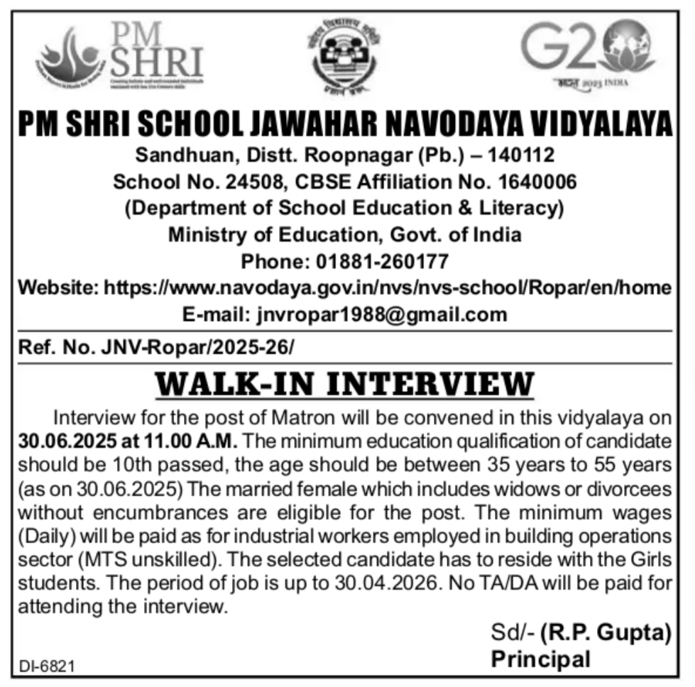Punjab Matron Bharti 2025Walk In InterviewPM SHRI SCHOOL JAWAHAR NAVODAYA VIDYALAYASandhuan, Distt. Roopnagar (Pb.) – 140112www.RozgarNews.Com