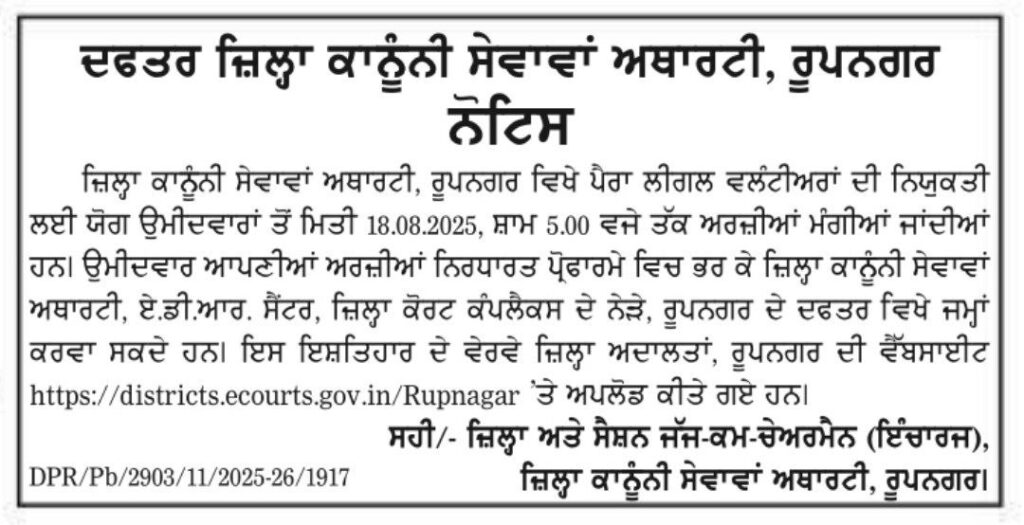 District Legal Services Authority, RupnagarPara Legal Volunteers Recruitment2025Short Detailswww.RozgarNews.Com