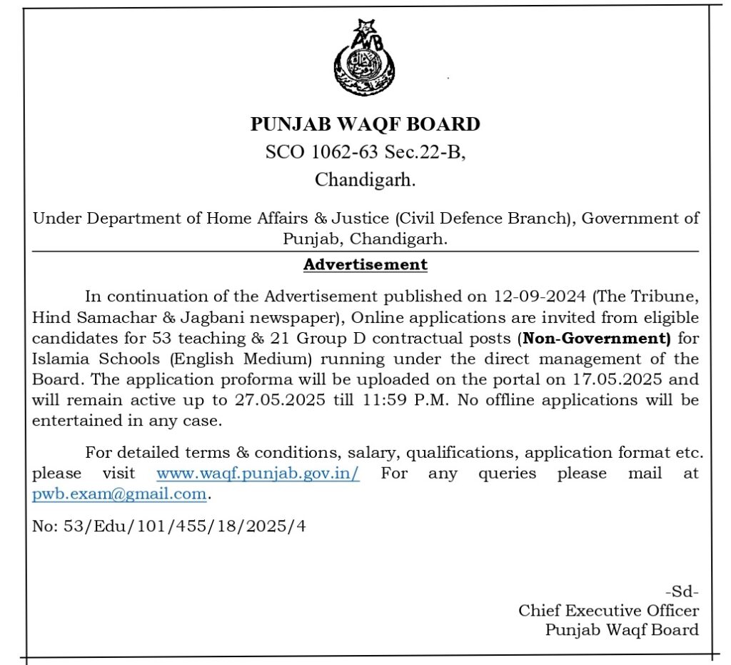 Punjab Waqf Board Recruitment 2025Punjab Waqf Board School Recruitment 2025Teaching and Non Teaching PostsShort Details Of Advt Notificationwww.RozgarNews.Com