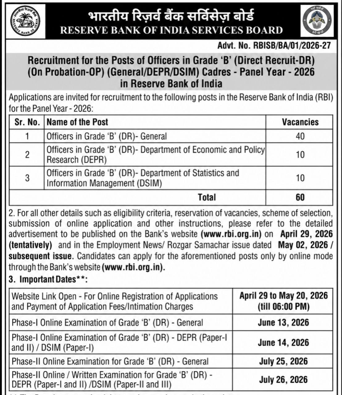 The Reserve Bank of India (RBI) plays a crucial role in the country’s economy, primarily through its function as the central bank. As part of its workforce expansion and development, RBI conducts recruitment for various positions, including the prestigious Grade ‘B’ officer posts. The latest announcement for the recruitment drive for 2026 under advt. no.: rbisb/ba/01/2026-27 has garnered significant interest among job seekers.