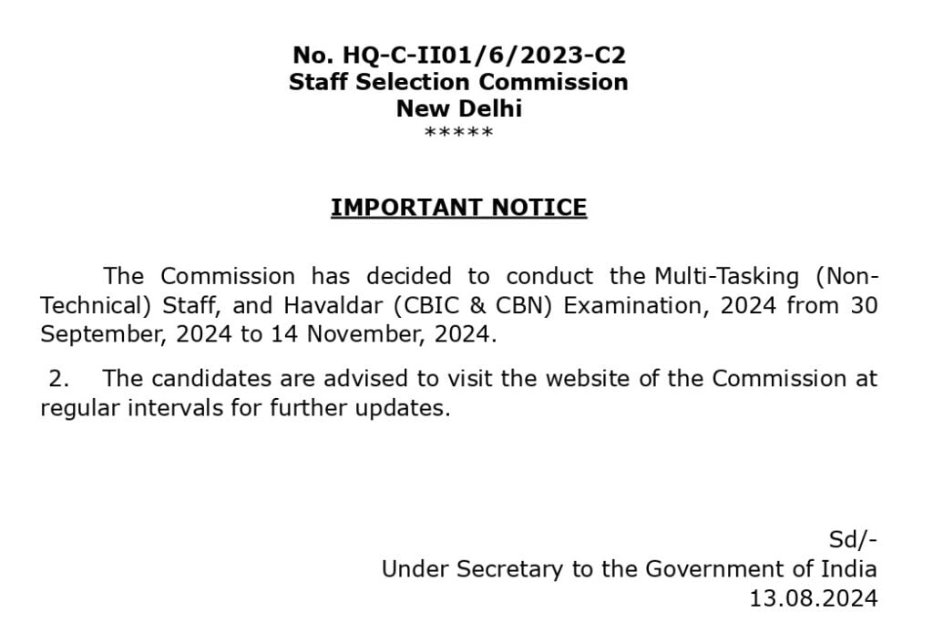 SSC MTS Havaldar Exam DateStaff Selection Commission (SSC)MTS, Havaldar Recruitment 2024Short Details Of Advt Notification |
