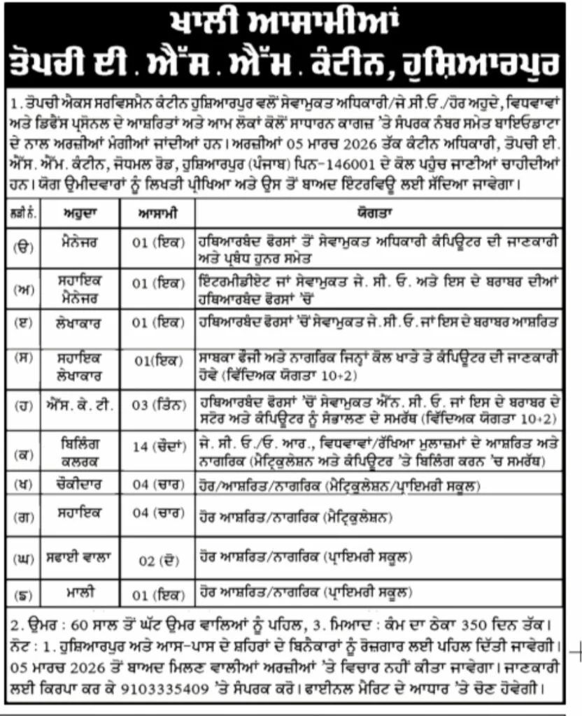The Topchi ESM Canteen in Hoshiarpur is known for its supportive environment and numerous employment opportunities. As we look ahead to 2026, the recruitment process will open doors for many eager candidates seeking a fulfilling career.