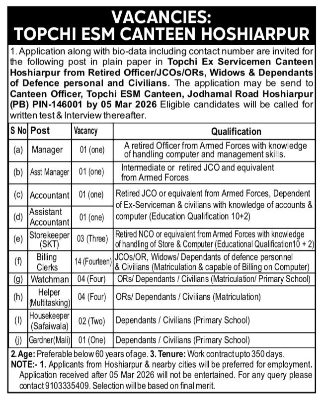 Topchi ESM Canteen HoshiarpurWatchman, Helper, Housekeeper, Gardner, Billing Clerk, Store Keeper,Accountant, Assistant Manager Posts