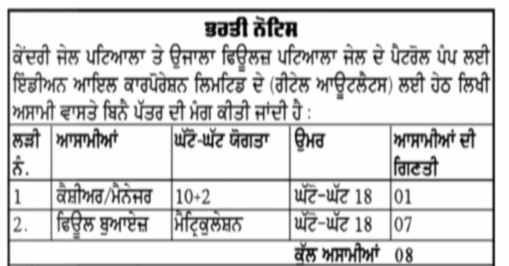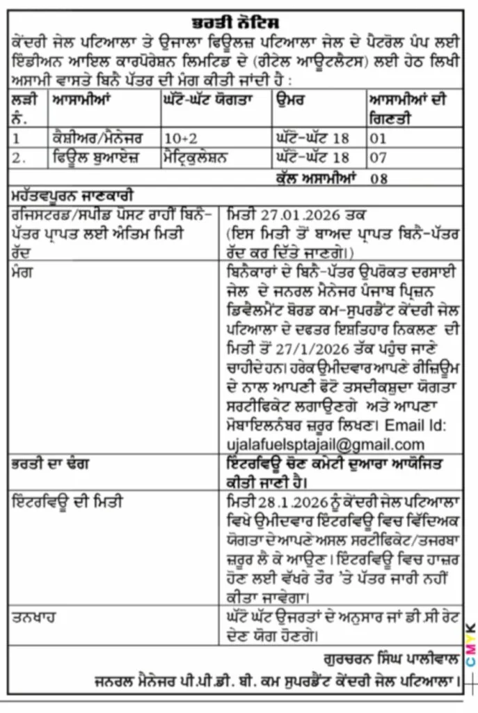 General Manager PPD B. cum Superintendent Central Jail PatialaCashier/Manager, Fuel Boys,Applications are invited for the following posts for Indian Oil Corporation Limited(Retail Outlets) for the petrol pump of Central Jail Patiala and Ujala Fuels Patiala Jail: